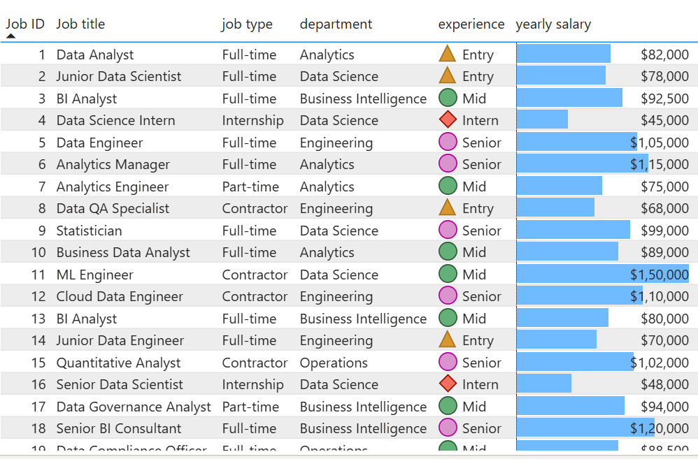 - Click OK. The table will now show a left-to-right bar in each YearlySalary cell proportional to the number, with the currency value shown at the right.